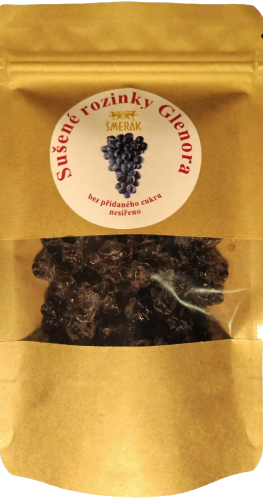 Sušené hrozinky jsou z odrůdy Glenora, vyrobeny z čerstvých hroznů z naší produkce. Jedná se o jediné moravské hrozinky na trhu. Mají nezaměnitelnou chuť, jsou bez přidaného cukru, nesířené. Skvělé pro přímou konzumaci, přídavek do cereálií, vložka při pečení domácího pečiva. Díky jednoduchému hroznovému cukru ve výrobku rychle doplníte energii, ale také železo a vlákninu.